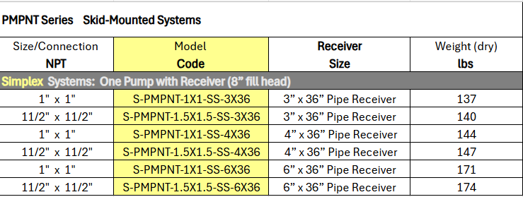 Complete packaged skid systems include one or more Pressure Motive Pumps (PMPs) along with a vented receiver mounted oncommon base. The receiver initially collects the condensate prior to it flowing into the pump tank and temporarily stores the condensate during the PMPs’ discharge cycle when the pump tank is pressured with steam. The receiver and vent must be adequately sized to allow for proper flash steam separation without building up pressure inside the receiver. Higher condensate pressures and temperatures, or higher condensate loads require larger receiver and vent sizes. Duplex & Triplex Systems can be used for increased capacity or in the event of a single pump failure. All components of the system are properly sized and pre-piped together; requiring onlyfour connections to be made in the field.