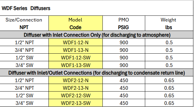 The WDF1 Diffuser can be fitted to the outlet of any steam or air trap discharging to the atmosphere. Maximum Operating Pressure is 900 PSIG. The WDF2 Diffuser can be fitted to the outlet of any steam or air trap discharging to a condensate return line. Maximum Operating Pressure is 450 PSIG.