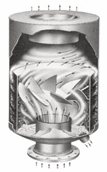 Exhaust steam enters the EHF or EHS exhaust head and encounters internal baffles that change the flow direction and reduce velocity. Moisture droplets and solid particles lose momentum and fall back into the exhaust line due to gravity. Clean, dry steam exits upward to atmosphere, preventing condensate carryover and minimizing noise and splash.