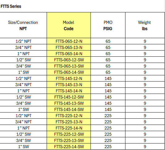Helpful Selection Information: Select a model with a higher maximum working pressure than the steam system. For example, the FTT-065 has a maximum working pressure of 65 PSIG.