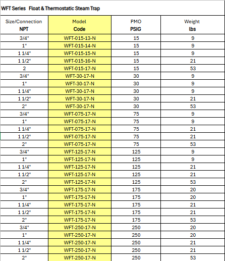 Helpful Selection Information: Select a model with a higher maximum working pressure than the steam system. For example, the WFT-015 has a maximum working pressure of 15 PSIG.