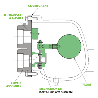 Mechanism Kit: (does not include float, thermostat, cover gasket): (1) seat & float arm assembly