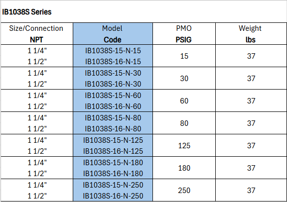 Helpful Selection Information: Select a model with a maximum operating pressure (PMO) that meets or exceeds the maximum steam pressure or the trap may not open. For example, the IB-1032-14-N-250 has a PMO of 250 PSIG. Choose a model that will handle the capacity requirement based on the differential pressure across the trap.