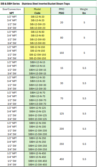 Helpful Selection Information: The PMO (maximum operating pressure) rating of model selected must meet or exceed the maximum steam pressure or the trap may not open. For example; the SIB-12-N-150 has a PMO of 150 PSIG. Condensate capacity (lbs/hr) of the trap is based on the differential pressure across the trap.